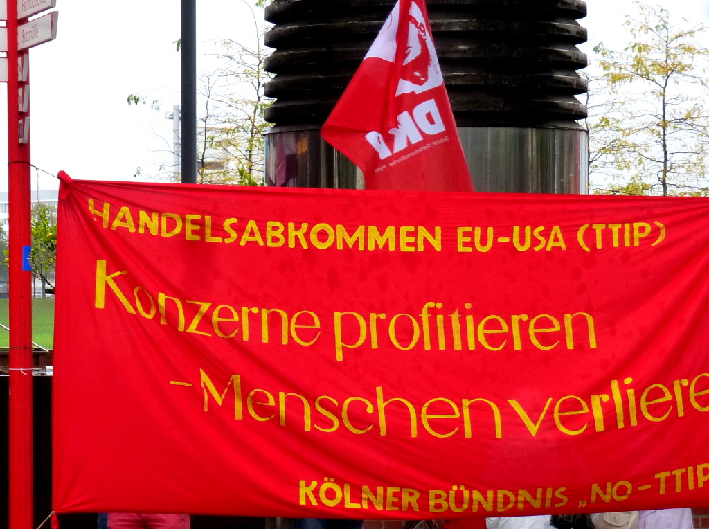 Köln, 9. Oktober 2014. Die Initiative No TTIP Köln protestiert bei widrigem Wetter gegen die Kanzlei Luther, die hier am Rheinauhafen an einer ungemütlichen Kreuzung ihren Sitz hat. In den geheimen Verhandlungen über TTIP und anderen Freihandelsabkommen werden Bestimmungen ersonnen und erörtert, mit denen Entscheidungen von Parlamenten als Handelshemmnisse von privaten Schiedsgerichten angefochten werden können. In diesem Sinne agieren schon jetzt international tätige Anwalts- und Wirtschaftskanzleien wie Freshfield und Luther. Die Kanzlei Luther verklagt im Auftrag des Energieriesen Vattenfall die Bundesregierung wegen des Atomausstiegs nach Fukushima auf 3,7 Milliarden Euro.
