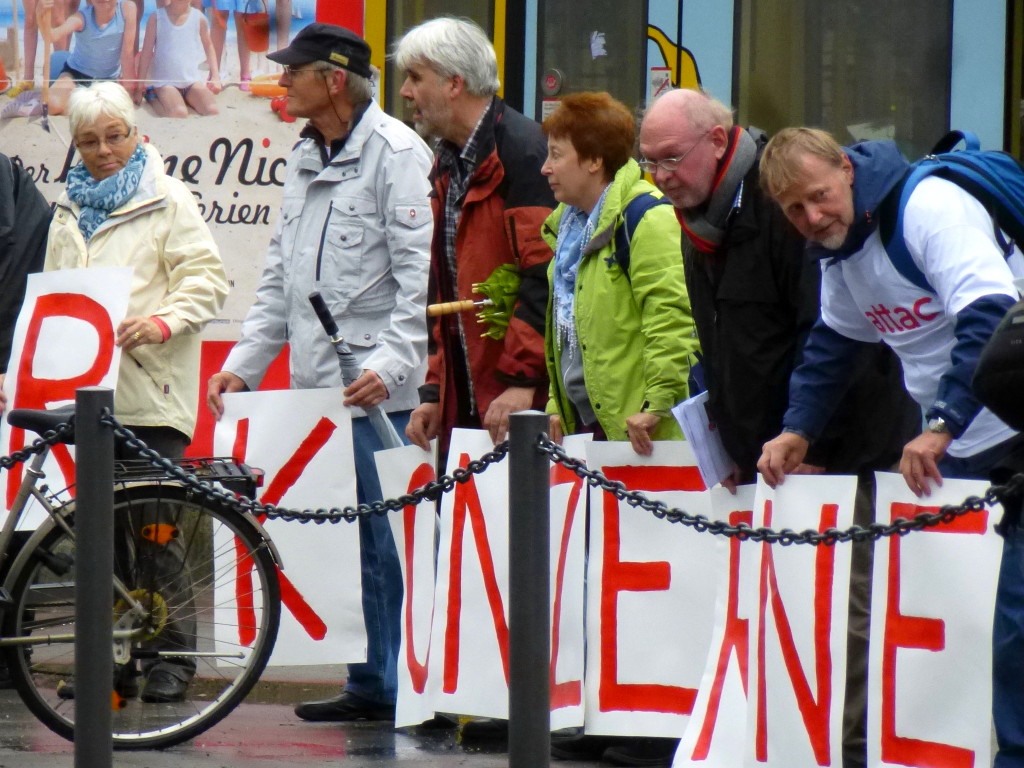 No TTIP protestiert gegen den Versuch, den Atomausstieg zu verhindern. No TTIP will weder Lohndrückerei noch Chlorhühner! Nötig sind gesetzliche Schutznormen gegen die ungehemmte Profitmacherei auf Kosten unserer Gesundheit, sozialer Standards und demokratischer Rechte.
