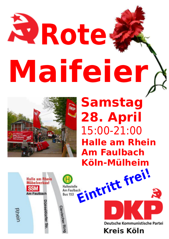 Wie jedes Jahr wird die DKP-Köln eine politische Maifeier veranstalten. Vorgesehen sind neben den üblichen einleitenden Worten Redebeiträge von