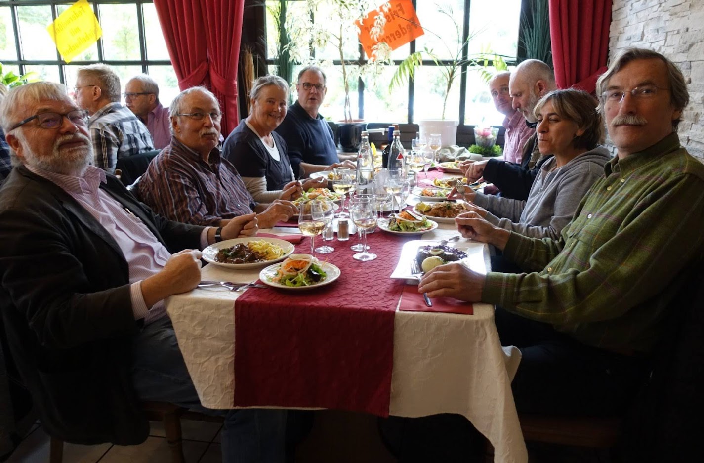 3. Oktober 2018 | Diesmal mit Edith und Heinz Stehr, die gestern aus Elmshorn gekommen waren, um ihre Enkelin in Köln zu besuchen. Wir lassen uns auf Bänken des Dernauer Festplatzes nieder, in den Gläsern Spätburgunder, das bevorzugte Gewächs der Gegend. Die Winzergenossenschaft nennt sich Dagernova, als Hinweis auf den römischen Ursprung des hiesigen Weinbaus. Sie organisiert 600 Winzer, die vorwiegend in Steillagen zu arbeiten haben, häufig im Nebenerwerb. Die beste Lage in Dernau ist der Pfarrwingert, ein Berghang, der der Kirche abgerungen werden musste.