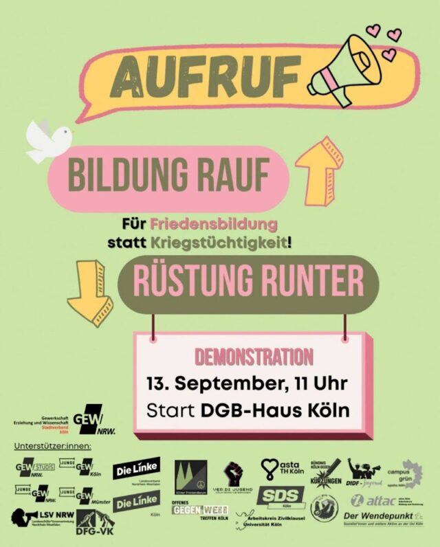 Die DKP Köln begrüßt und unterstützt den Aktionstag der GEW mit Bündnispartnerinnen und Bündnispartnern die Demonstration «Bildung rauf, Rüstung runter – Friedensbildung statt Kriegstüchtigkeit».