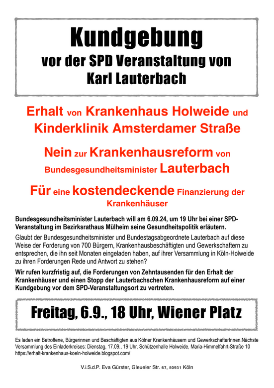 Kund­ge­bung vor der SPD Ver­an­stal­tung von Karl Lauterbach Wir unter­stüt­zen die Kund­ge­bung gegen Karl Lau­ter­bach und die Kran­ken­haus­re­form und für den Erhalt von Köl­ner Kli­ni­ken am 6. Sep­tem­ber 2024 am Wie­ner Platz. Die Zeit drängt! Die Kran­ken­haus­re­form und die dadurch vor­an­ge­trie­be­nen Kran­ken­haus­schlie­ßun­gen müs­sen gestoppt werden.  Das städ­tisch beschlos­sene Ende des Kran­ken­hau­ses Hol­weide und der Kin­der­kli­nik in der Ams­ter­da­mer Straße bedeu­tet real eine Ver­schlech­te­rung der medi­zi­ni­schen Ver­sor­gung der Men­schen in Köln. Der Haupt­aus­schuss des Rats der Stadt hat bereits in den Som­mer­fe­rien eine Beschleu­ni­gung der Schlie­ßung der bei­den Köl­ner Kran­ken­häu­ser beschlos­sen. Unter ande­rem sol­len des­halb jetzt die bei­den Betriebs­kin­der­gär­ten in Hol­weide