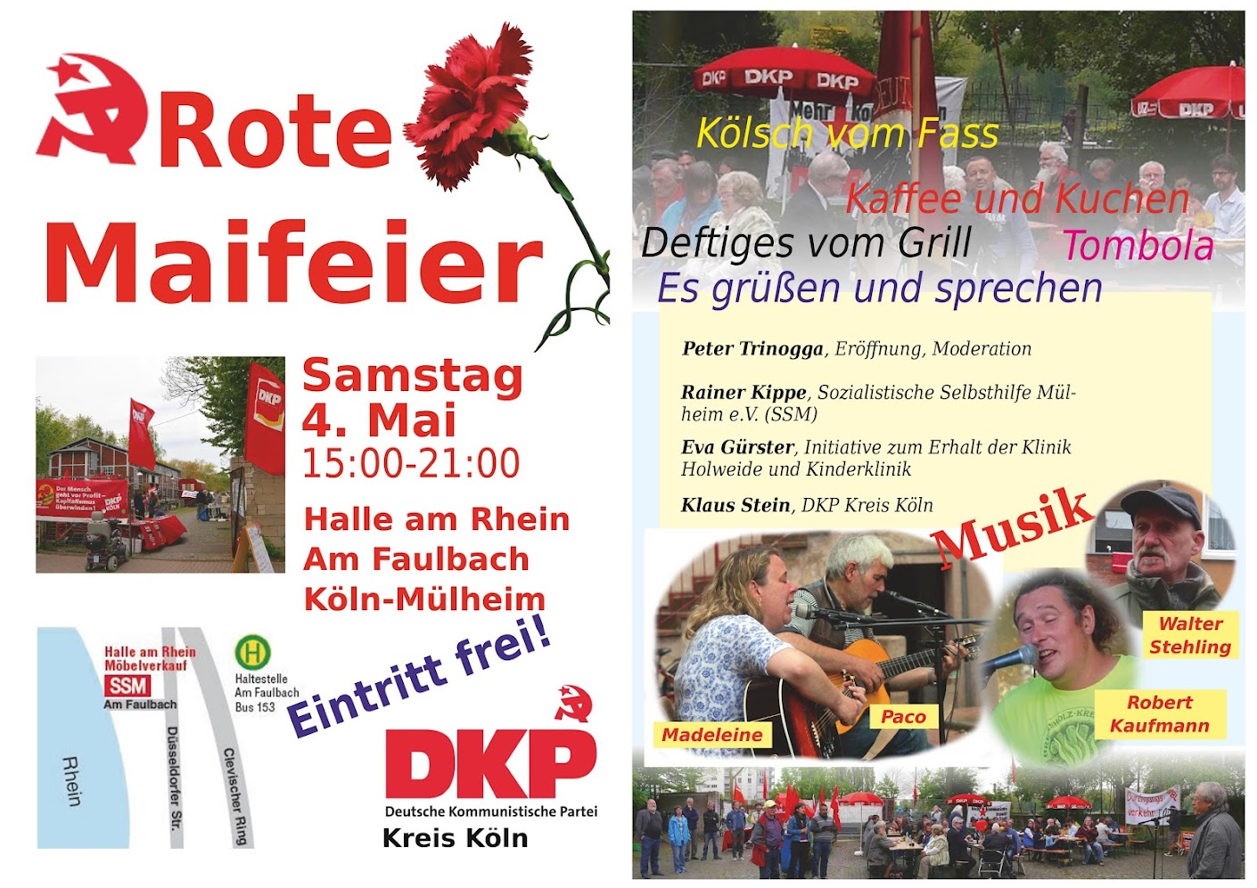 DKP Kreis Köln lädt in die Halle am Rhein Sie ist wie­der da, die Rote Mai­feier der DKP Köln! DKP Kreis Köln lädt zur Roten Mai­feier in die Halle am Rhein DKP Kreis Köln lädt zur Roten Mai­feier in die Halle am Rhein (wei­tere Fotos)