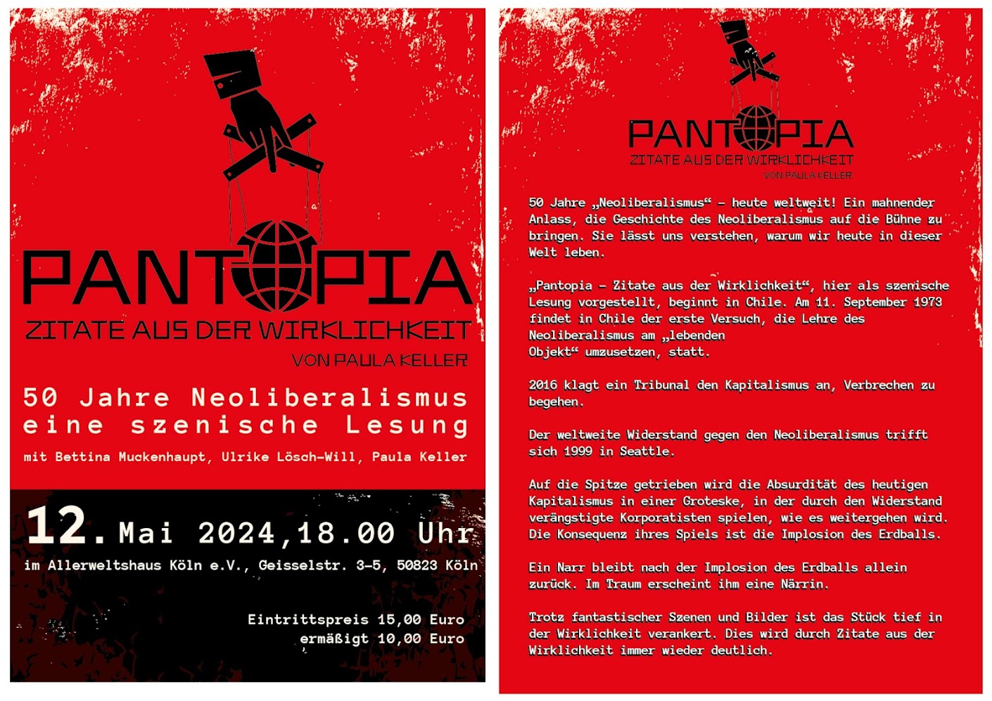 50 Jahre Neo­li­be­ra­lis­mus Eine sze­ni­sche Lesung Paula Kel­ler «Pan­to­pia» Zitate aus der Wirklichkeit 50 Jahre Neo­li­be­ra­lis­museine sze­ni­sche Lesung mit Bet­tina Mucken­haupt, Ulrike Lösch-Will, Paula Keller am 12. Mai 2024, 18:00 Uhr  im Aller­welts­haus, Geis­sel­str. 3–5, 50823 Köln Ein­la­dung zu Paula Kel­lers «Pan­to­pia»