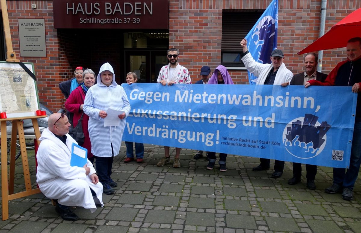 Rücknahme der Kündigungen! 10. April 2018. Aktivisten von Recht auf Stadt, MieterInnen und Freunde, einige in Bademänteln, übergaben heute im Rahmen einer kleinen Aktion 582 Unterschriften im Büro des Wohnungsunternehmens «Haus Baden». Sie wurden zwar freundlich empfangen, die Mappe mit den Unterschriften entgegengenommen, eine Stellungnahme erhielten sie aber nicht. Die Petition fordert von «Haus Baden» die sofortige Rücknahme der Wohnungskündigungen. Solche Kündigungen hatten 22 Mieterinnen und Mieter des Hauses Trajanstraße 10 Ende Januar erhalten. Die Presse berichtete darüber. Am 6. Februar protestierten 80 Demonstranten vor dem Haus. In den folgenden Wochen sind bei Mahnwachen von «Recht auf Stadt» Unterschriften unter die