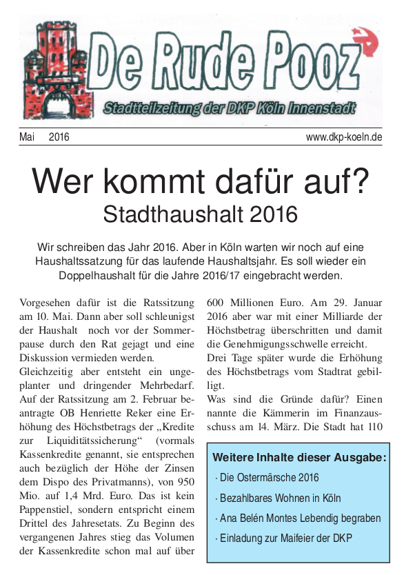 Ausgabe Mai 2016 Wer kommt dafür auf? Stadthaushalt 2016 Wir schreiben das Jahr 2016. Aber in Köln warten wir noch auf eine Haushaltssatzung für das laufende Haushaltsjahr. Es soll wieder ein Doppelhaushalt für die Jahre 2016⁄17 eingebracht werden. … Die Zeitung als pdf